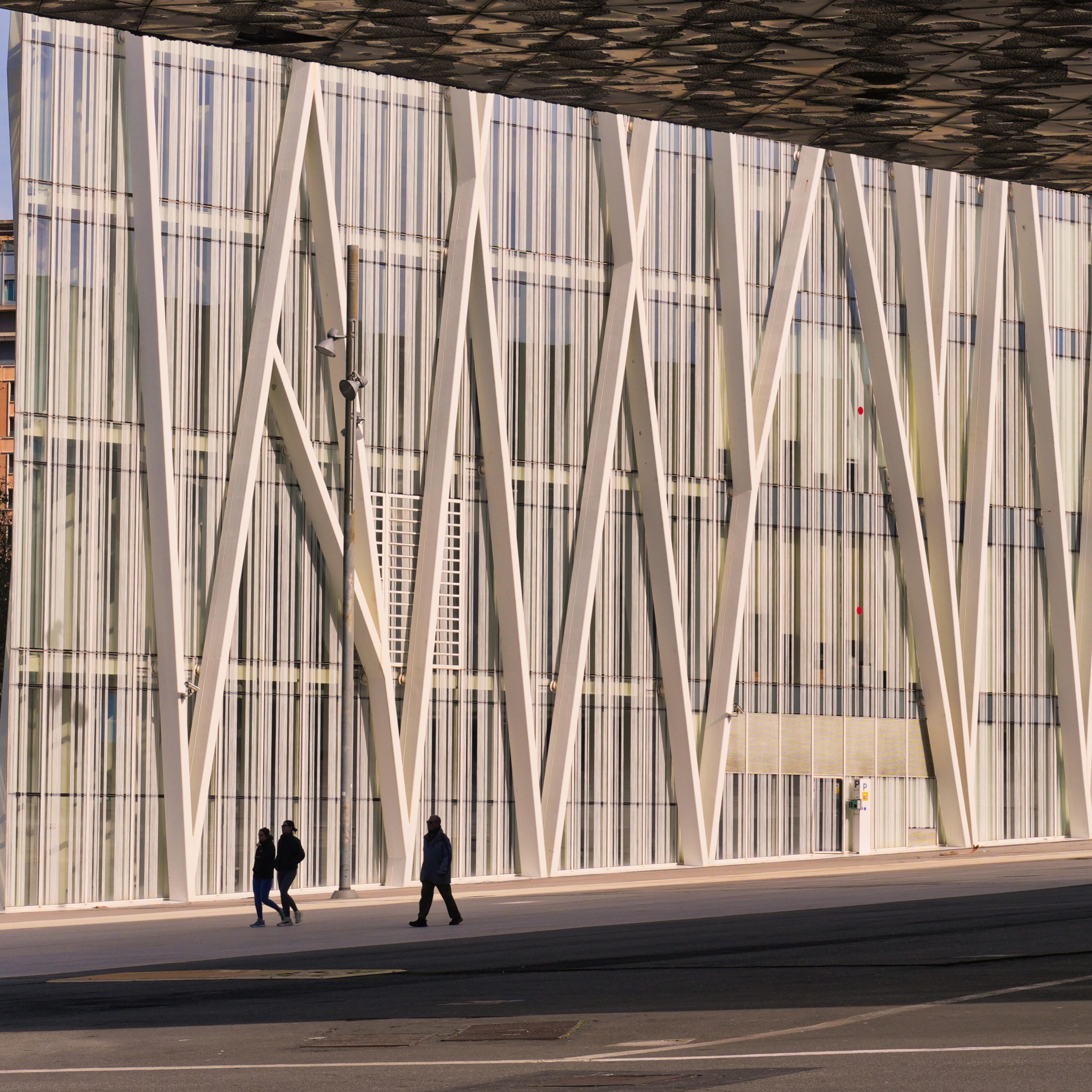 - Luz y textura: Cómo el sol de la tarde revela detalles en el hormigón, el ETFE y el cristal.